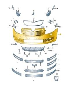 Оригинальный передний бампер для Шкода Октавия А7 поставляется в комплекте с решеткой радиатора, которая вмонтирована в бампер автомобиля. Отдельно оригинальная решетка радиатора не производится. Если у Вас повреждена решетка радиатора, то это можно исправить только заменой бампера.