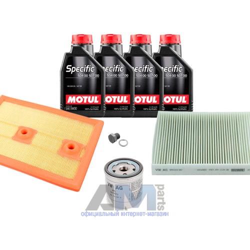 Состав набора ТО: Моторное масло - 4 л. Масляный фильтр VAG 04E115561H- 1 шт. Воздушный фильтр VAG 04E129620- 1 шт. Салонный фильтр VAG 6R0820367- 1 шт. Свечи зажигания- 04E905612C- 4 шт. Пробка масляного поддона с кольцом- 1 шт.