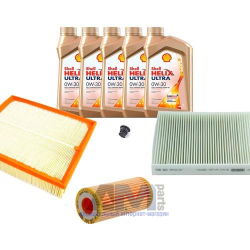 Состав набора ТО: Масло моторное Shell Helix 0W30 (допуск 502/505 или AV-L 504/507) - 5 л.Масляный фильтр VAG 06L115562B- 1 шт.Воздушный фильтр VAG 6C0129620A- 1 шт.Салонный фильтр VAG 6R0820367- 1 шт.Свечи зажигания- 06K905601B- 4 шт.Пробка масляного поддона с кольцом- 1 шт. Пробка масляного поддона с кольцом- 1 шт.