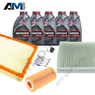 В Наборе ТО собраны оригинальные расходные материалы для прохождения ТО (фильтры и свечи) и масло LUKOil Special A3/B4 0w30 с допуском VAG 502 00/505 00.