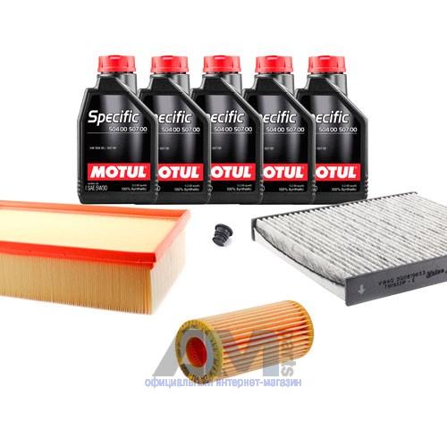 Состав набора ТО: Моторное масло Motul 5W30 (504/507) 5 л.Масляный фильтр VAG 06L115562B- 1 шт.;Воздушный фильтр VAG 5Q0129620B- 1 шт.;Салонный фильтр VAG 5Q0819669- 1 шт.;Свечи зажигания- 06K905601B- 4 шт.Пробка масляного поддона с кольцом- 1 шт. Пробка масляного поддона с кольцом- 1 шт.