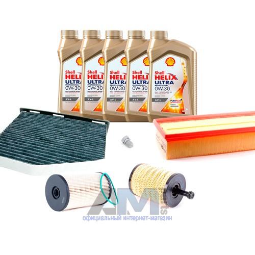 Состав набора ТО: Масло моторное Shell Helix 0W30 (допуск AV-L 504/507) - 5 л.Масляный фильтр VAG 071115562C- 1 шт.;Воздушный фильтр VAG 1K0129620D- 1 шт.;Салонный фильтр VAG JZW819653B- 1 шт.;Пробка масляного поддона с кольцом- 1 шт. Пробка масляного поддона с кольцом- 1 шт.
