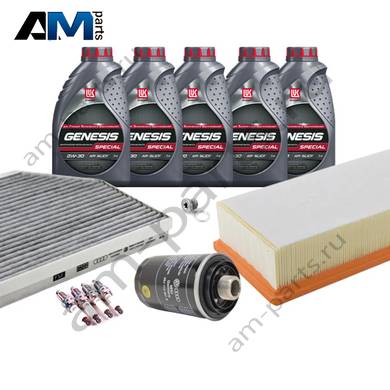 В Наборе ТО собраны оригинальные расходные материалы для прохождения ТО (фильтры и свечи) и масло LUKOil Special A3/B4 0w30 с допуском VAG 502 00/505 00.