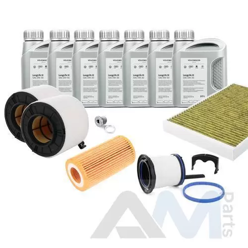 Состав набора ТО: Оригинальное моторное масло VAG Long Life III- 6 л.Масляный фильтр 059198405B- 1 шт.Воздушный фильтр 8W0133843- 1 шт.Салонный фильтр 4M0819439B- 1 шт.Пробка масляного поддона с кольцом- 1 шт. Пробка масляного поддона с кольцом- 1 шт.