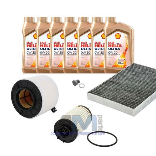 Состав набора ТО: Масло моторное Shell Helix 0W30 (допуск 502/505 или AV-L 504/507) - 7 л.Масляный фильтр VAG 059198405- 1 шт.;Воздушный фильтр VAG 8K0133843D- 1 шт.;Салонный фильтр VAG 8K0819439B- 1 шт.;Топливный фильтр VAG 8T0127401A- 1 шт.Пробка масляного поддона с кольцом- 1 шт. Пробка масляного поддона с кольцом- 1 шт.