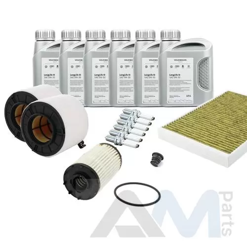 Состав набора ТО: Оригинальное моторное масло VAG- Special G 5W40 (допуск 502/505)- 6 л.Оригинальный масляный фильтр 06M198405F- 1 шт. Оригинальный воздушный фильтр 8W0133843- 2 шт. Оригинальный салонный фильтр 4M0819439B- 1 шт. Пробка поддона 06L103801- 1 шт. Оригинальные свечи зажигания 06M905606F- 6 шт.