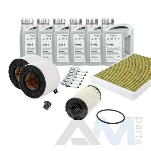Состав набора ТО: Оригинальное моторное масло VAG- Special C 0W30 (допуск 502/505)- 6 л.Оригинальный масляный фильтр 06M198405F- 1 шт.Оригинальный воздушный фильтр 8W0133843- 2 шт.Оригинальный салонный фильтр 4M0819439B- 1 шт.Пробка поддона 06L103801- 1 шт.Оригинальные свечи зажигания 06M905606F- 6 шт.