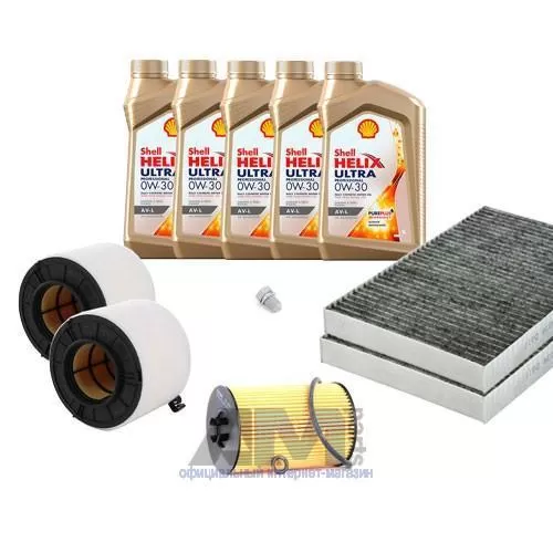 Состав набора ТО: Масло моторное Shell Helix 0W30 (допуск AV-L 504/507) - 5 л.Оригинальный масляный фильтр 03N115562B- 1 шт. Оригинальный воздушный фильтр 4K0133844E- 1 шт. Оригинальный салонный фильтр 4M0819439B- 1 шт. Фильтр топливный 8W0127434- 1 шт. Пробка поддона N90813202- 1 шт.