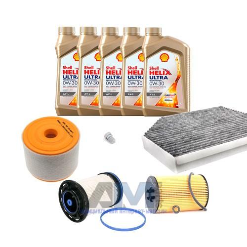 В Наборе ТО собраны оригинальные расходные материалы для прохождения ТО (фильтры и свечи) и моторное масло Shell Helix Ultra 0W30 AV-L (допуск VW 504 00/507 00).