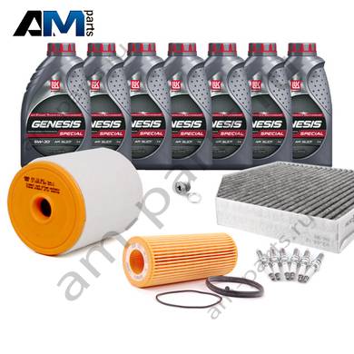 Состав набора ТО: Оригинальное моторное масло VAG Long Life III- 7 л.Оригинальный масляный фильтр 06E115562C- 1 шт.Оригинальный воздушный фильтр 4G0133843- 1 шт.Оригинальный салонный фильтр 4H0819439- 1 шт.Оригинальные свечи зажигания 06E905601- 6 шт.Пробка масляного поддона с кольцом- 1 шт. Пробка масляного поддона с кольцом- 1 шт.