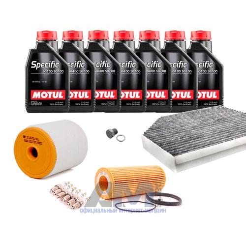 Состав набора ТО: Моторное масло Motul 5W30 (504/507) 7 л.Масляный фильтр VAG 06E115562C- 1 шт.Воздушный фильтр VAG 4G0133843- 1 шт.Салонный фильтр VAG 4H0819439- 1 шт.Пробка масляного поддона с кольцом- 1 шт. Пробка масляного поддона с кольцом- 1 шт.