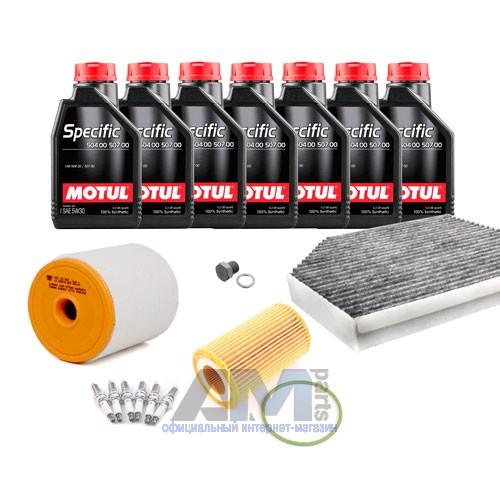 Состав набора ТО: Моторное масло - 7 л. Масляный фильтр VAG 06E115562H- 1 шт. Воздушный фильтр VAG 4G0133843- 1 шт. Салонный фильтр VAG 4H0819439- 1 шт. Пробка масляного поддона с кольцом- 1 шт.