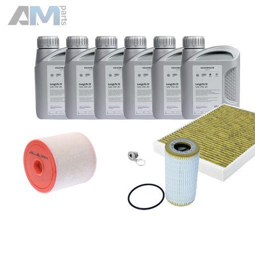Состав набора ТО: Оригинальное моторное масло VAG- LongLife III (допуск 504/507)- 6 л. Оригинальный масляный фильтр 059198405B- 1 шт. Оригинальный воздушный фильтр 4K0133844D- 1 шт. Оригинальный угольный фильтр салона 4M0819439B- 1 шт. Пробка масляного поддона с кольцом- 1 шт. Оригинальные Фильтр топливный 4N0127401A- 1 шт.