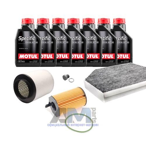 Состав набора ТО: Масло моторное Castrol Edge Professional LL III 5W30 (504/507) или 0W30 (502/505) или Shell Helix Ultra- 7 л. Фильтр масляный- 1 шт. Фильтр воздушный- 1 шт. Фильтр салона- 1 шт. Пробка масляного поддона с кольцом- 1 шт.