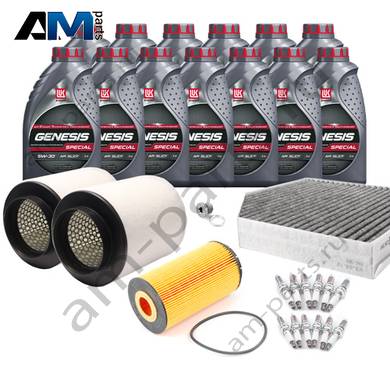 Состав набора ТО: Оригинальное моторное масло VAG- Special C 0W30 (допуск 502/505)- 13 л.Оригинальный масляный фильтр 07C115562E- 1 шт.;Оригинальный воздушный фильтр 4H0129620M- 2 шт.;Оригинальный салонный фильтр 4H0819439- 1 шт.; Оригинальные свечи зажигания 101905622A- 12 шт.Пробка масляного поддона с кольцом- 1 шт. Пробка масляного поддона с кольцом- 1 шт.