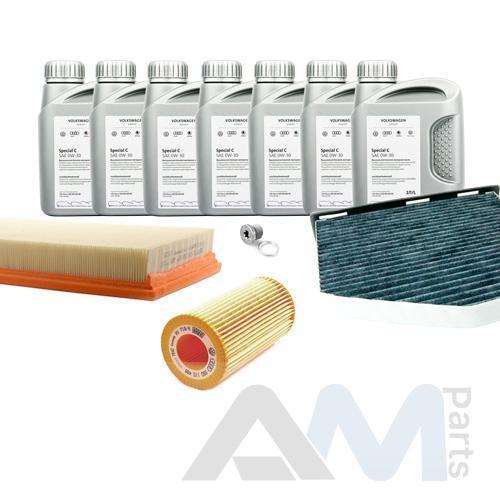 В Наборе ТО собраны оригинальные расходные материалы для прохождения ТО (фильтры и свечи) и оригинального моторного масла Special C 0W30 (допуск VW 502 00/505 00).