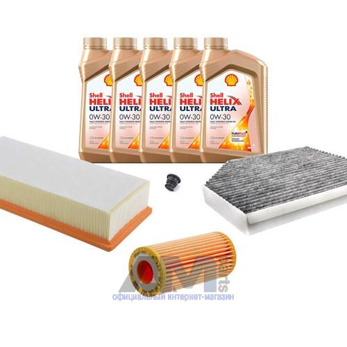 Состав набора ТО: Масло моторное Shell Helix 0W30 (допуск 502/505 или AV-L 504/507) - 5 л.Масляный фильтр VAG 06J115403Q- 1 шт.;Воздушный фильтр VAG 8R0133843K- 1 шт.;Салонный фильтр VAG 8K0819439B- 1 шт.;Свечи зажигания- 06H905601A- 4 шт.Пробка масляного поддона с кольцом- 1 шт. Пробка масляного поддона с кольцом- 1 шт.
