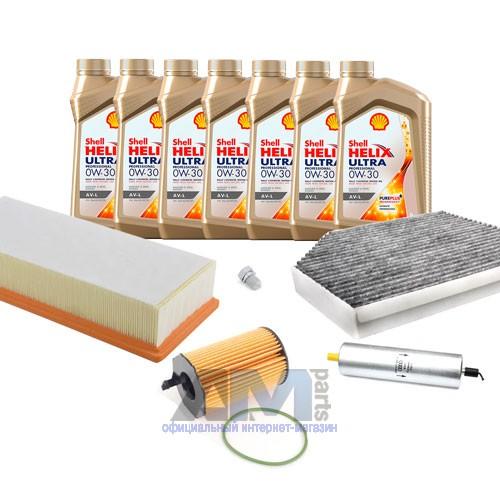 Состав набора ТО: Масло моторное Shell Helix 0W30 (допуск AV-L 504/507) - 7 л.Масляный фильтр VAG 059198405- 1 шт.;Воздушный фильтр VAG 8K0133843D- 1 шт.;Салонный фильтр VAG 8K0819439B- 1 шт.;Пробка масляного поддона с кольцом- 1 шт. Пробка масляного поддона с кольцом- 1 шт.