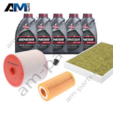 В Наборе ТО собраны оригинальные расходные материалы для прохождения ТО (фильтры и свечи) и масло LUKOil Special A3/B4 0w30 с допуском VAG 502 00/505 00.