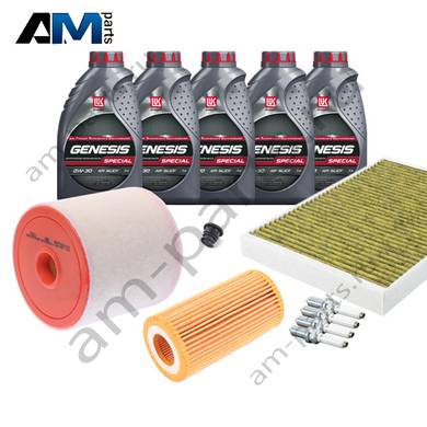 В Наборе ТО собраны оригинальные расходные материалы для прохождения ТО (фильтры и свечи) и масло LUKOil Special A3/B4 0w30 с допуском VAG 502 00/505 00.