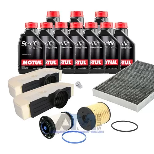 Состав набора ТО: Оригинальное моторное масло VAG Long Life III (504/507)- 9 л.Оригинальный масляный фильтр 057198405D- 1 шт. Оригинальный воздушный фильтр 4M0133843A- 2 шт. Оригинальный салонный фильтр 4M0819439B- 1 шт. Фильтр топливный 4M0127434H- 1 шт. Пробка поддона - 1 шт.