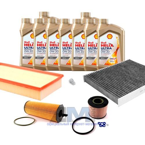 В Наборе ТО собраны оригинальные расходные материалы для прохождения ТО фильтры и моторное масло Shell Helix Ultra 0W30 AV-L (допуск VW 504 00/507 00).