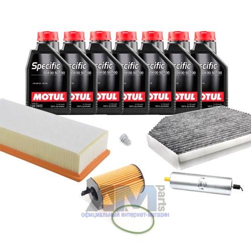 Состав набора ТО: Масло моторное Castrol Edge Professional LL III 5W30 (504/507) или 0W30 (502/505) или Shell Helix Ultra- 9 л. Фильтр масляный- 1 шт. Фильтр воздушный- 1 шт. Фильтр салона- 1 шт. Пробка масляного поддона с кольцом- 1 шт.