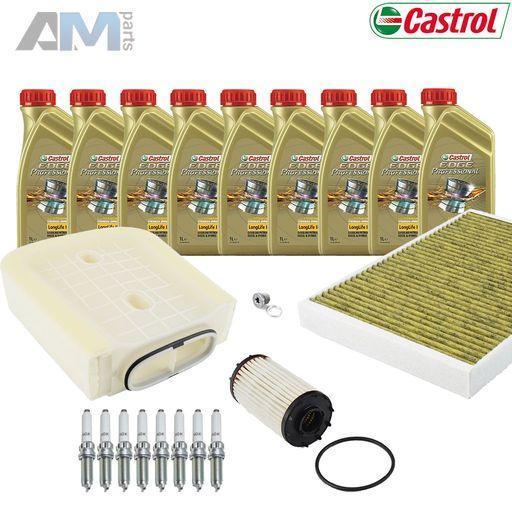 Состав набора ТО: Оригинальное моторное масло VAG- LongLife III (допуск 504/507)- 9 л. Оригинальный масляный фильтр 06M198405F- 1 шт. Оригинальный воздушный фильтр 4M0133843G- 1 шт. Оригинальный угольный фильтр салона 4M0819439B- 1 шт. Пробка масляного поддона с кольцом- 1 шт. Оригинальные Свечи зажигания 0P2905601- 8 шт.
