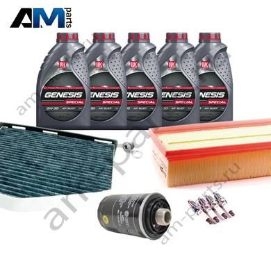 В Наборе ТО собраны оригинальные расходные материалы для прохождения ТО (фильтры и свечи) и масло LUKOil Special A3/B4 0w30 с допуском VAG 502 00/505 00.