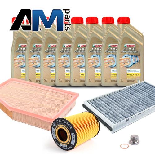 Состав набора: Оригинальный масляный фильтр 11427542021- 1 шт. Оригинальный воздушный фильтр 13717521023- 1 шт. Оригинальный салонный фильтр 64319171858- 1 шт. Масло моторное Castrol 5W30 (0W30)- 8 л. Пробка масляного поддона 7119905428- 1 шт. Уплотнительное кольцо 7119963308- 1 шт.