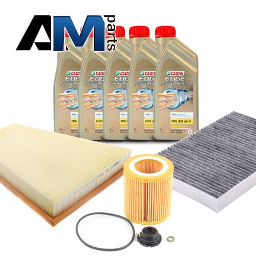 Состав набора: Оригинальный масляный фильтр 11427953125- 1 шт. Оригинальный воздушный фильтр 13717582908- 1 шт. Оригинальный салонный фильтр 64116809933- 1 шт. Масло моторное Castrol 5W30 (0W30)- 5 л. Пробка масляного поддона 11137605018- 1 шт.