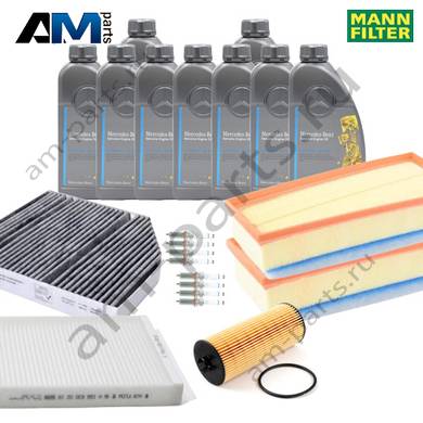 Состав набора ТО-1/3: Масляный фильтр HU6008Z- 1 шт. Воздушный фильтр слева C30025- 1 шт. Воздушный фильтр справа C32017- 1 шт. Фильтр салона CUK26023- 1 шт. Оригинальное масло МB 229.5- 9 л.