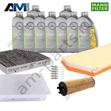 Состав набора ТО-2/4: Масляный фильтр A2561840000- 1 шт. Воздушный фильтр A6540940004- 1 шт. Фильтр салона A1678350400- 1 шт. Фильтр салона пылевой A1678350200- 1 шт. Свечи зажигания A2541590000- 6 шт. Моторное масло МB 229.51- 9 л.