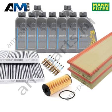 Состав набора ТО-2/4: Масляный фильтр A2781800009- 1 шт. Воздушный фильтр A2780940004- 2 шт. Фильтр салона A2228300318- 1 шт. Свечи зажигания A0041598103- 8 шт. Моторное масло МB 229.5- 9 л.