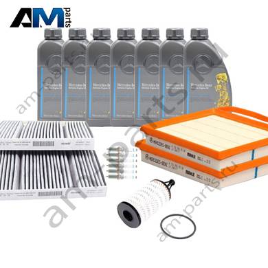 Состав набора ТО-1/3: Масляный фильтр A2761800009- 1 шт. Воздушный фильтр A2760940504- 2 шт. Фильтр салона A2228300318- 1 шт. Моторное масло MERCEDES МB 229.5- 7 л.