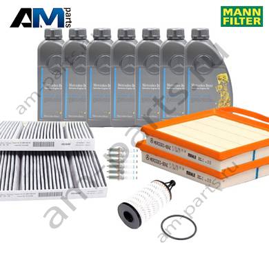 Состав набора ТО-2/4: Масляный фильтр A2761800009- 1 шт. Воздушный фильтр A2760940504- 2 шт. Фильтр салона A2228300318- 1 шт. Свечи зажигания A2701590600- 6 шт. Моторное масло МB 229.5- 7 л.