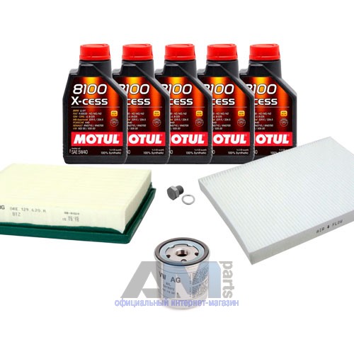 Состав набора ТО: Масло моторное Motul 5W40 8100 X-cess- 4 л.Фильтр масляный 04E115561H- 1 шт.Фильтр воздушный 04E129620A- 1 шт.Фильтр салона угольный- 1 шт.Пробка масляного поддона N90288901 + кольцо N0138157- 1 шт.