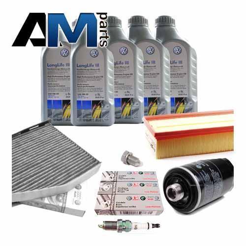 Состав набора ТО: Оригинальное моторное масло VAG- Special G 5W40 (допуск 502/505)- 5 л. Оригинальный масляный фильтр 06L115562B- 1 шт. Оригинальный воздушный фильтр 5Q0129620B- 1 шт. Оригинальный угольный фильтр салона- 1 шт. Пробка масляного поддона 06L103801- 1 шт. Оригинальные свечи зажигания 06K905601B- 4 шт.