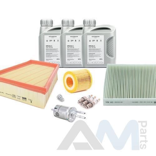 Состав набора ТО: Оригинальное моторное масло VAG- Special G 5W40- 3 л.Оригинальный масляный фильтр 03D198819C- 1 шт.Оригинальный воздушный фильтр 5JF129620A- 1 шт.Оригинальный угольный фильтр салона 6R0819653- 1 шт.Пробка масляного поддона N90813202- 1 шт.Оригинальные свечи зажигания 101905601F- 3 шт.