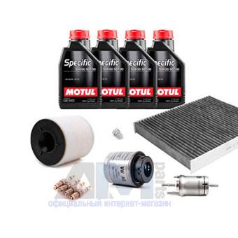 Состав набора ТО: Масло моторное Motul 5W30 (504/507) или 5W30 (502/505)- 4 л.Фильтр масляный 03C115561J- 1 шт.Фтльтр воздушный 6R0129620A- 1 шт.Фильтр салонный 6R0820367- 1 шт.Пробка масляного поддона N90813202- 1 шт.Свечи зажигания 03F905600A- 4 шт.Фильтр топливный 1K0201051K- 1 шт.