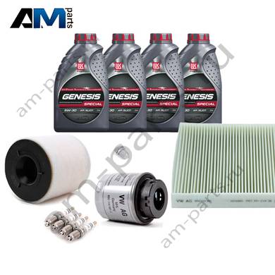 Состав набора ТО: Оригинальное моторное масло VAG- Special C 0W30 (допуск 502/505)- 4 л. Оригинальный масляный фильтр 03C115561J- 1 шт. Оригинальный воздушный фильтр 6R0129620A- 1 шт. Оригинальный угольный фильтр салона 6R0819653- 1 шт. Пробка масляного поддона N90813202- 1 шт. Оригинальные свечи зажигания 03F905600A- 4 шт. Оригинальный топливный фильтр 1K0201051K- 1 шт.
