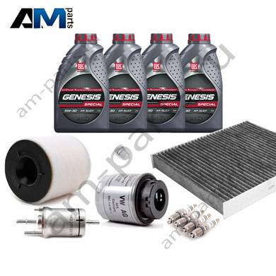 Состав набора ТО: Масло моторное Motul 5W30 (504/507) или 5W30 (502/505)- 4 л.Фильтр масляный 03C115561J- 1 шт.Фтльтр воздушный 6R0129620A- 1 шт.Угольный фильтр салона 6R0819653- 1 шт.Пробка масляного поддона N90813202- 1 шт.Свечи зажигания 03F905600A- 4 шт.Фильтр топливный 1K0201051K- 1 шт.
