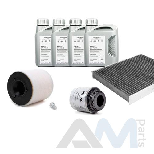 Состав набора ТО: Оригинальное моторное масло VAG- Special C 0W30 (допуск 502/505)- 4 л. Оригинальный масляный фильтр 03C115561J- 1 шт. Оригинальный воздушный фильтр 6R0129620A- 1 шт. Оригинальный угольный фильтр салона 6R0819653- 1 шт. Пробка масляного поддона N90813202- 1 шт. Оригинальные свечи зажигания 03F905600A- 4 шт.