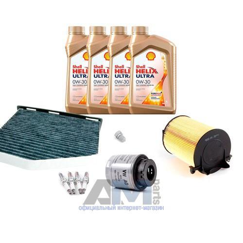Состав набора ТО: Масло моторное Shell Helix 0W30 (допуск 502/505 или AV-L 504/507) - 4 л.Фильтр масляный 03C115561J- 1 шт.Фильтр воздушный 1F0129620- 1 шт.Фильтр салонный JZW819653B- 1 шт.Пробка масляного поддона N90813202- 1 шт.