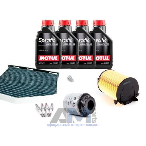 Состав набора ТО: Оригинальное моторное масло VAG Long Life III (504/507)- 4 л.Оригинальный масляный фильтр 03C115561H- 1 шт.Оригинальный воздушный фильтр 1F0129620- 1 шт.Оригинальный салонный фильтр JZW819653B- 1 шт.Пробка масляного поддона N90813202- 1 шт.Оригинальные свечи зажигания 101905626- 4 шт.