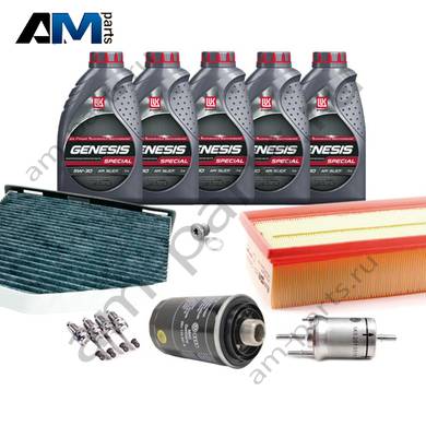 Состав набора ТО: Масло моторное Shell Helix 0W30 (допуск 502/505 или AV-L 504/507) - 5 л.Фильтр масляный 06J115403Q- 1 шт.Фтльтр воздушный 1K0129620D- 1 шт.Фильтр салонный JZW819653B- 1 шт.Пробка масляного поддона N91167901 + кольцо N0138157- 1 шт.Свечи зажигания 06H905601A- 4 шт.