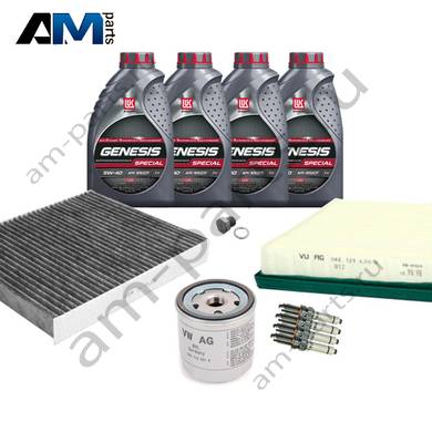 Состав набора ТО: Оригинальное моторное масло VAG- Special G 5W40- 4 л.Оригинальный масляный фильтр 04E115561H- 1 шт.Оригинальный воздушный фильтр 04E129620A- 1 шт.Оригинальный угольный фильтр салона- 1 шт.Пробка масляного поддона N90288901 + кольцо N0138157- 1 шт.Оригинальные свечи зажигания 04E905601B- 4 шт.
