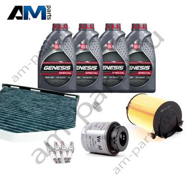 Состав набора ТО: Оригинальное моторное масло VAG- Special C 0W30 (допуск 502/505) - 4 л.Оригинальный масляный фильтр 03C115561J- 1 шт.Оригинальный воздушный фильтр 1F0129620- 1 шт.Оригинальный салонный фильтр (угольный) JZW819653B- 1 шт.Пробка масляного поддона N90813202- 1 шт.Оригинальные свечи зажигания 101905626- 4 шт.