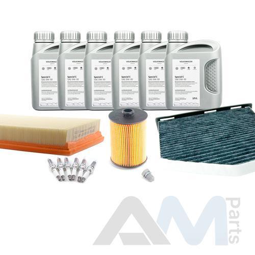 Состав набора ТО: Оригинальное моторное масло VAG- Special G 5W40 (допуск 502/505) - 6 л.Оригинальный масляный фильтр 03H115562- 1 шт.Оригинальный воздушный фильтр 1K0129620- 1 шт.Оригинальный салонный фильтр (угольный) JZW819653B- 1 шт.Пробка масляного поддона N90813202- 1 шт.Оригинальные свечи зажигания 101905622A- 6 шт.