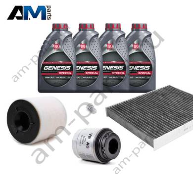 Состав набора ТО: Оригинальное моторное масло VAG- Special C 0W30 (допуск 502/505) - 4 л.Оригинальный масляный фильтр 03C115561H- 1 шт.Оригинальный воздушный фильтр 6R0129620A- 1 шт.Оригинальный салонный фильтр (угольный) 6Q0819653B- 1 шт.Пробка масляного поддона N90813202- 1 шт.Оригинальные свечи зажигания 03C905601B- 4 шт.Оригинальный топливный фильтр 6Q0201051J- 1 шт.
